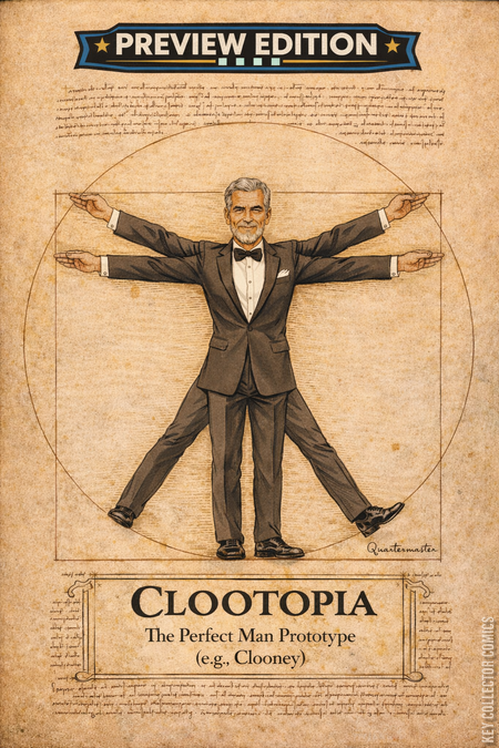 THE PERFECT MAN HAS ARRIVED. And yes& he looks a lot like George Clooney. CLOOTOPIA: PREVIEW EDITION leads right into Clootopia #1 - coming next month! A new Sci-Fi satire where perfection goes mass-market when everyone can buy their own personal George Clooney! 25� price point = ORDER BIG. Perfect for Free Comic Book Day weekend traffic, counter stacks, and impulse grabs. One-shot Preview Edition -- no reprint planned. Retailer Incentive: 1:25 Variant Cloonipatch Cover (limited / while supplies last).
