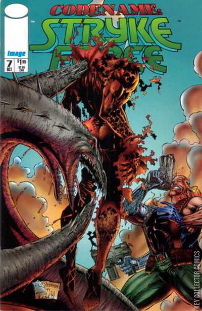 Cover pencils by Brandon Peterson, inks by Billy Tan. Untitled, script by David Wohl (plot) and Marc Silvestri (plot, script), pencils by Brandon Peterson, David Finch, and Billy Tan, inks by Mark Morales, Aaron Sowd, and Billy Tan; Strykeforce and Stormwatch attempt to destroy the shape shifting alien plaguing Skywatch; Little do they realize, however, that Sh'rrrnn has accidentally killed Bloodbow and decided to take his place on the team. A page of penciled story art for next issue by Joe Benitez.