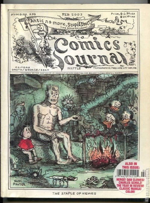 The Magazine of Comics News and Criticism. The Journal celebrates its 250th issue with a double-sized extravaganza featuring unforgettable interviews with a fistful of the finest cartoonists of all time, indispensable essays from more than a dozen of comics' finest critics, and the first English translation of one of the world's greatest comics short stories! The Journal presents a translated excerpt from Numa Sadoul's legendary interview with the great Herge, an interview with Raymond Briggs, an all-new "Back to the Drawing Board" interview with Dan Clowes, and a career-spanning interview with Gary Panter! The Journal also makes comics history by being the first to publish manga cartoonist Yoshiharu Tsuge's classic short story "Neji-shiki" in English. The issue's comprehensive criticism section features essays on topics like "What's Wrong with Comics Criticism," "Why Team Comics is Still a Bad Idea," "EC Comics and the Chimeras of Memory," as well as essays on the state of post-9/11 editorial cartooning, racial caricature in comics, young cartoonists of note, and the state of the medium around the world! This issue also includes TCJ's "2002: Year in Review" assessment of the comics and events that mattered most. Cover by Gary Panter.