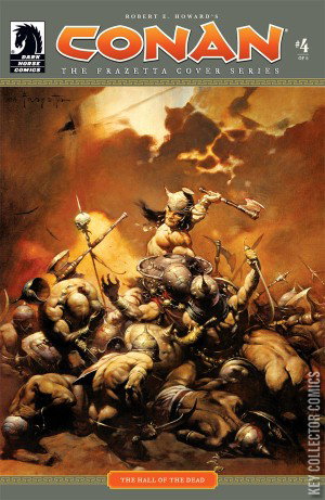 CONAN: THE FRAZETTA COVER SERIES #4 The fourth installment in Conan: The Frazetta Cover Series features Frank Frazetta's stunning painting, 'The Destroyer,' and includes an adaptation of 'The Hall of the Dead'-an unfinished tale left by Robert E. Howard and fleshed out by Mike Mignola, Cary Nord, and Dave Stewart. Pursued by a small army, Conan heads for shelter in the ancient ruins of a forgotten city, lured by a flimsy rumor of treasure. Instead, he finds the fallen idols of twisted gods and a lot of croaking creatures. Luckily, frogs are no match for an armed Cimmerian . . . right? Conan soon finds himself battling a slithering monstrosity and an onslaught of undead warriors! Retainers to a lord long forgotten awaken to protect a treasure so sizable even the dead can't bear to see it stolen. Can a cunning Cimmerian and a foe-turned-ally withstand the power of such dark sorceries long enough to escape with some loot and their lives?