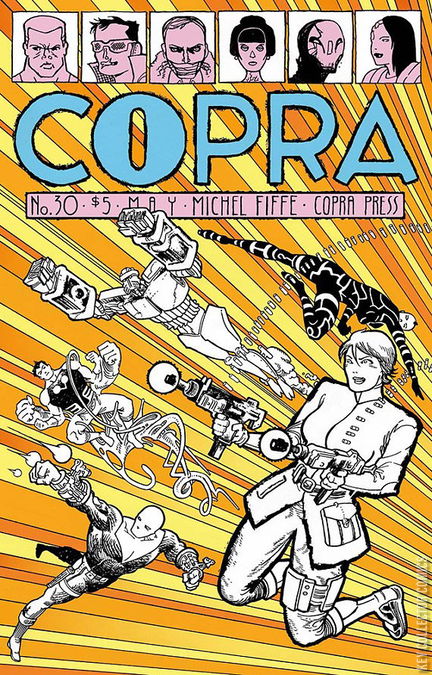 COPRA versus COPRA in this milestone 30th issue! The classic team rumbles with Team X and things go down in Miami the only way they can: sleazy, chaotic, brutal. COPRA #30 : 24 full-color pages on sturdy Cougar Opaque paper for five bucks. Written, drawn, and colored by Michel Fiffe.