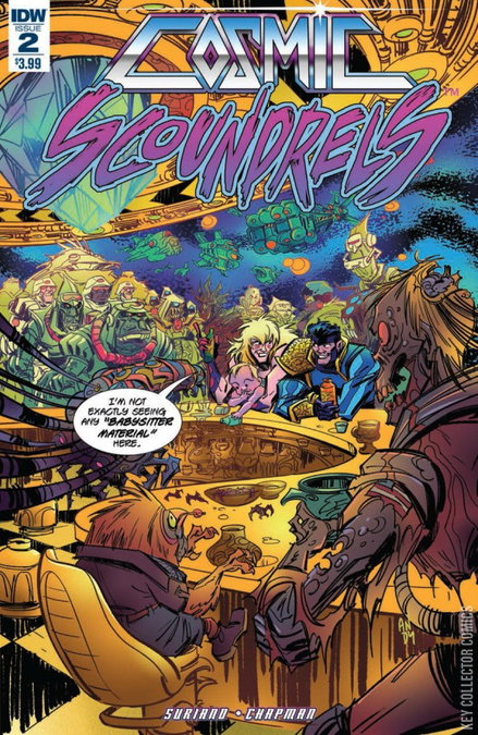 After discovering last issue that their big score was actually a baby, the Scoundrels are faced with a choice: keep the kid and start calling themselves Cosmic Scoundrels & Son... or sell him to the highest bidder at The Fence, an intergalactic black market space mall, home of chromosomal bath houses, discount hadron colliders, and dudes named 'Hairbath.'