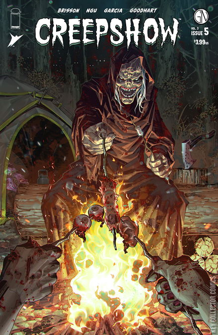 MINISERIES FINALE CREEPSHOW, VOL. 3 wraps with a pair of delightfully dark tales! Renowned writer ED BRISSON (Batman) and acclaimed cover artist KAEL NGU (making his interior work debut) bring a frightening fable that starts with hiking and camping—and ends with kicking and screaming! Then, bestselling author KAMI GARCIA (Teen Titans: Raven) nails her nightmares to the page with artist ISAAC GOODHART (Catwoman) in a story about two very different sisters and one horrifying new home!