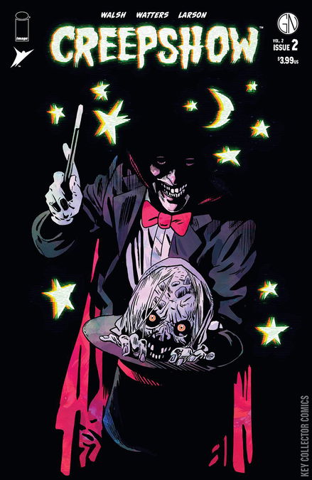 'CREEPSHOW is back with two more terrifying tales! First, MICHAEL WALSH (THE SILVER COIN) broadcasts a chilling yarn about a down-on-his-luck dad and his son's obsession with TV in ''The Man With No Eyes''! Then, DAN WATTERS (HOMESICK PILOTS, Arkham City) and Hugo Award-winning illustrator ABIGAIL LARSON (Sandman Universe: The Dreaming) will render you speechless with the story of a young woman burdened and the price she'll pay for silence in ''Stop Haunting Me''!'