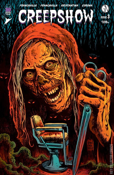 The Creep scares up two all-new standalone stories in this star-studded anthology based on the hit Shudder TV series. FRANCESCO FRANCAVILLA (Night of the Ghoul, Detective Comics) and L MARLOW FRANCAVILLA welcome you to a barbershop where the locals share tales of their greatest kills, and the hunters can just as easily become prey. ARIELA KRISTANTINA (Chain) and JORGE CORONA (THE ME YOU LOVE IN THE DARK) journey to a temple hidden within an island paradise, where many visit - but not everyone leaves.