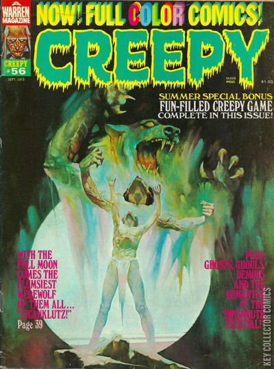 Home / Warren / Creepy / Creepy #56 Warren Released September 1973 Creepy #56 Add to Collection Want It Synopsis No synopsis available. Issue 56 of 145 Add to Collection Buy it on eBay Buy on eBay Low $5 Mid $12 High $40 Synopsis No synopsis available. Details Series Creepy Cover Date September 1973 Pages 84 UPC N/A Cover Price $1.00 Final Order Cutoff N/A Creators Cover Artist Manuel Sanjulian Price Guide Log in or subscribe to access detailed graded price information and market insights. Log In Subscribe