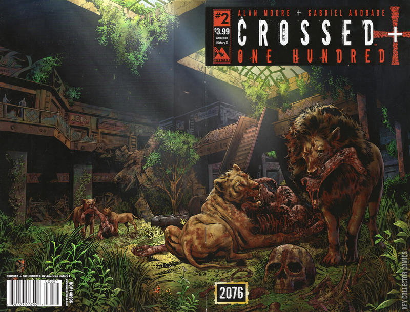 Alan Moore places his unique stamp upon the Crossed universe, as he and artist Gabriel Andrade paint a vivid picture of the future 100 years after the outbreak! Future Taylor leads a salvage team that is exploring the ruins of Tennessee. She tries to piece together the past, while they gather supplies for the future. Together with the settlement of Chooga, they take the tentative steps of a new generation as they attempt to understand the horror that nearly wiped out the human race. But disturbing threads emerge, some sightings of Crossed occur, and a century-old mystery begins to be revealed. This multi-layered story delivers a new brand of horror to Crossed fans at the hands of the scribe that redefined the comics medium. Enter Alan Moore's world of grueling survival with Crossed +100. This masterwork is a self-contained whole new world, no prior knowledge of the Crossed series is needed. All the covers for the series have been planned out by Alan Moore, with the images enriching and expanding on the series. Clues and glimpses of what came before, and what might be, are found throughout the variant covers. American History X Wraparound - Each of these will depict a specific time in the past hundred years, showing how things have changed and offering a peek at some key events. Each cover will display the year in which it takes place to help build the full picture. Crossed Culture - These are all images of how the Crossed have changed the way they live. With few humans left to hunt, and the animal kingdom thriving with predators, even the thrill-driven Crossed have had to make adjustments to their lifestyle. Future Tense - Each cover is a homage to a famous work of science fiction, and each of those original works ties into themes of this series. New World Order Wraparound - These are not for the faint of heart or delicate of constitution. We can't even picture them in this catalog, they are visions of what an ideal all-Crossed world would be. If the madmen have their dreams come true, what would the everyday life look like? These covers are brutally intense images of true horror and may have scenes of torture, depravity, and nudity. These are clearly for adults only. Each copy of this edition will ship in a sealed polybag with a protective slip cover over the actual image to assure it can be racked in stores. The graphic pictured here is the slip cover only. Due to all these special protective measures this edition is strictly limited to initial orders. Also available with Retailer Incentive covers of Red Crossed and Design Sketch, showing the original works of series artist Gabriel Andrade. Don't miss out on the ultra-rare CGC Numbered Edition as well!