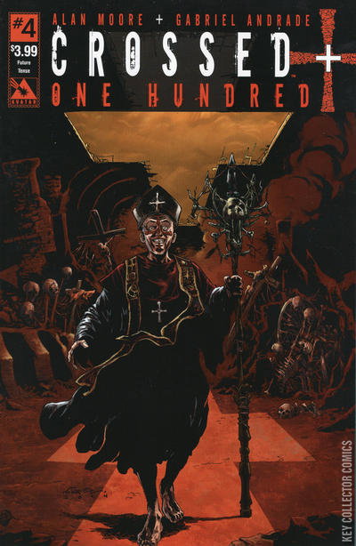 As the layers of the mystery begin to unravel, Future Taylor goes to compare notes with an archivist from another settlement. All the evidence points to an impossible conclusion. One that seems so radical, Future has to search out the final answers on her own. Alan Moore, the man who revolutionized the comics medium, returns to monthly comics and puts his unique stamp upon the Crossed universe, as he and artist Gabriel Andrade paint a vivid picture of the future 100 years after the outbreak! This multi-layered story delivers a new brand of horror to Crossed fans at the hands of the scribe that redefined the comics medium. This masterwork is a self-contained whole new world; no prior knowledge of the Crossed series is needed. All the covers for the series have been planned out by Alan Moore, with the images enriching and expanding on the series. Clues and glimpses of what came before, and what might be, are found throughout the variant covers. American History X Wraparound - Each of these will depict a specific time in the past hundred years, showing how things have changed and offering a peek at some key events. Each cover will display the year in which it takes place to help build the full picture. Crossed Culture - These are all images of how the Crossed have changed the way they live. With few humans left to hunt, and the animal kingdom thriving with predators, even the thrill-driven Crossed have had to make adjustments to their lifestyle. Future Tense - Each cover is a homage to a famous work of science fiction, and each of those original works ties into themes of this series. New World Order Wraparound - These are not for the faint of heart or delicate of constitution. We can't even picture them in this catalog, they are visions of what an ideal all-Crossed world would be. If the madmen have their dreams come true, what would the everyday life look like? These covers are brutally intense images of true horror and may have scenes of torture, depravity, and nudity. These are clearly for adults only. Each copy of this edition will ship in a sealed polybag with a protective slip cover over the actual image to assure it can be racked in stores. The graphic pictured here is the slip cover only. Due to all these special protective measures this edition is strictly limited to initial orders. Also available with Retailer Incentive covers of Red Crossed and Design Sketch, showing the original works of series artist Gabriel Andrade. Don't miss out on the ultra-rare CGC Numbered Edition as well!