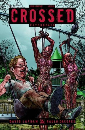 The most disturbed horror series of all time continues with an all-new seven-issue series written by David (Crossed: Family Values) Lapham! Harold Lorre carefully orchestrates the lives of those around him. To aid him in his twisted quest, and to satiate his twisted desires. Lorre might be the most evil man alive. Join us as Lapham and artist Raulo (Capt Swing) Caceres descend into a story about the worst aspects of human behavior, a tale of unspeakable evils, violent assaults on both mind and body, and of longing for death and the sweet release it will bring. When civilization crumbles in one terrifying moment; when people are gleefully breaking into unthinkable acts of violence all around you; when everyone you love has died screaming in agony: What do you do? There is no help. There is no hope. There is no escape. There are only the Crossed. Crossed: Psychopath #3 is available with a Regular cover by Jacen Burrows, a Wraparound cover by series artist Raulo Caceres, a Torture cover by Matt Martin, a Torture cover by Matt Martin, and a special rare Red Crossed retailer incentive.