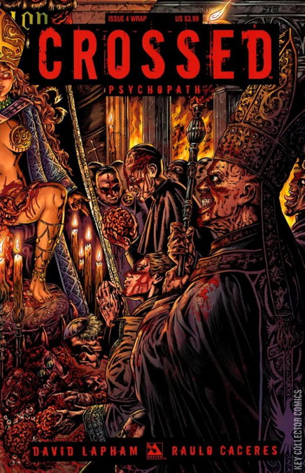 David Lapham continues to spin his seven-issue tale of pure evil! The band of survivors Harold Lorre has connected with begin to unravel as they are picked off and meet horrific fates. But no one suspects that Lorre himself might be a greater danger than the clans of Crossed they are hiding from. Lorre might be the most evil man alive, but also one of the craftiest. Join us as Lapham and artist Raulo (Capt Swing) Caceres descend into a story about the worst aspects of human behavior, a tale of unspeakable evils, violent assaults on both mind and body, and of longing for death and the sweet release it will bring. When civilization crumbles in one terrifying moment; when people are gleefully breaking into unthinkable acts of violence all around you; when everyone you love has died screaming in agony: What do you do? There is no help. There is no hope. There is no escape. There are only the Crossed.