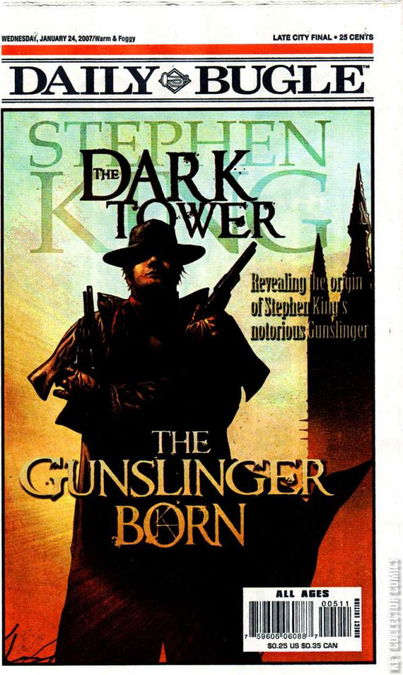 The "MONTHLY" DAILY BUGLE: Chock full of interviews, a monthly checklist of on sale titles, images, variant covers, all for the cover price of 25 cents. 8 big color pages of Marvel excitement. Cover feature: Dark Tower: The Gunslinger Born. Articles on: Annihilation: Heralds of Galactus - Terrax/Stardust, Legion of Monsters: Werewolf By Night, Spider-Man Family #1, 'Spider-Man: Back in Black,' Daredevil #94 and Punisher Presents: Barracuda MAX. Q & A with Ed Brubaker.