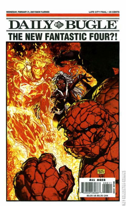 February 21st, 2007 - The "MONTHLY" DAILY BUGLE: Chock full of interviews, a monthly checklist of on sale titles, images, variant covers, all for the cover price of 25 cents. 8 big color pages of Marvel excitement. Cover feature: Fantastic Four #544 (and Black Panther #26). Articles on: Ultimate Power #4, Ultimate Spider-Man #106, Runaways Saga, Mighty Avengers and Marvel Zombies/Army of Darkness. Q & A with Frank Cho and Brian Michael Bendis. Comic strip by Fred Hembeck. See Fantastic Four #544