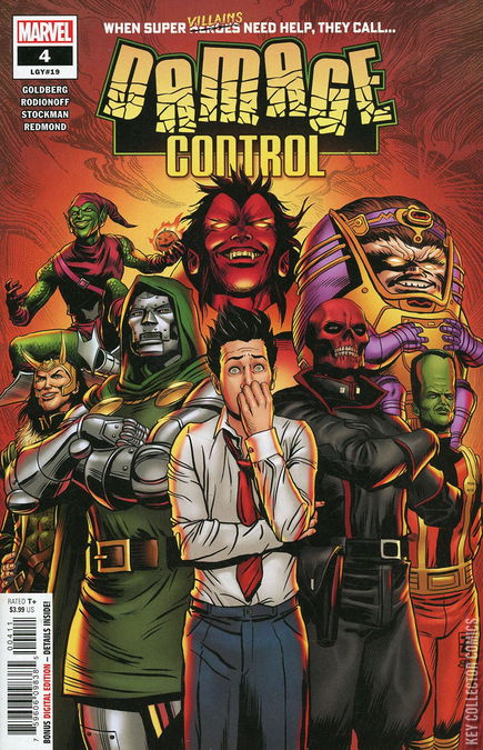 It’s been a tough first week for Gus at Damage Control. On Monday, he nearly caused a catastrophic Skrull attack. On Tuesday, he smushed a family who had been shrunk by Pym Particles, and on Wednesday, he turned himself into a monstrous guinea pig Kaiju. That’s why Gus has been banished down to research and development to assist Eugene Strausser. But introducing Gus to the one member of the Damage Control team who had a brief stint as a super villain could have dire consequences… Hans Rodionoff and Adam F. Goldberg write Gus into terrible situations and Nathan Stockman brings the bad guys to glorious life in our super villain-packed issue with appalling appearances by Doctor Doom, Green Goblin, Red Skull, Loki, the Wrecking Crew, M.O.D.O.K. and more.