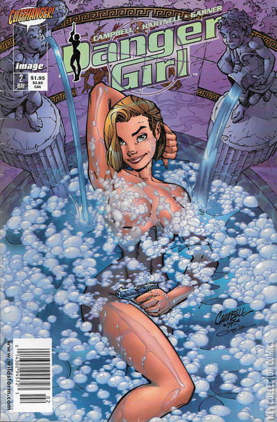 Abbey Chase and the other Danger Girls lose The Peach as he and his goons master their escape. Abbey destroys two helicopters in the process, the last by removing the grenade pin of the sniper before falling comfortably onto the tarpaulin top of a truck Sydney Savage is driving.Picking up the trail, the Danger Girls head for Interlaken, Switzerland after hitching a ride by a kind rural french man, who we find out is Secret Agent Zero in disguise. Interlaken is a swiss alps resort where they believe the first part of the mystic armor - the shield - is being held by The Peach. Abbey and Sydney rendevous with girl magnet agent Johnny Barracuda, the undercover guest of a soiree attended by The Peach. Johnny, as the producer Ooter Frumpenpuff, and Abbey, as his date, make an unsubtle appearance at the party. Sydney and Natalia Kassle join as undercover waitresses and Abbey takes the opportunity to sniff around. The Peach is talking with two German twins known only as Cain and AbelMeanwhile, Johnny Barracuda runs across Kid Dynamo, who seemingly has been on the wrong end of Johnny's attention previously. Abbey, making her way upstairs in search of the shield, finds what she is looking for only to be interupted by The Peach. Cue final panel of Abbey in bubble bath.