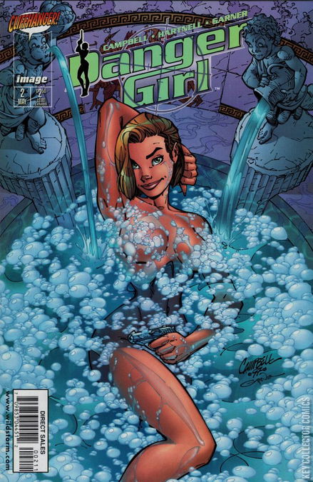 Abbey Chase and the other Danger Girls lose The Peach as he and his goons master their escape. Abbey destroys two helicopters in the process, the last by removing the grenade pin of the sniper before falling comfortably onto the tarpaulin top of a truck Sydney Savage is driving.Picking up the trail, the Danger Girls head for Interlaken, Switzerland after hitching a ride by a kind rural french man, who we find out is Secret Agent Zero in disguise. Interlaken is a swiss alps resort where they believe the first part of the mystic armor - the shield - is being held by The Peach. Abbey and Sydney rendevous with girl magnet agent Johnny Barracuda, the undercover guest of a soiree attended by The Peach. Johnny, as the producer Ooter Frumpenpuff, and Abbey, as his date, make an unsubtle appearance at the party. Sydney and Natalia Kassle join as undercover waitresses and Abbey takes the opportunity to sniff around. The Peach is talking with two German twins known only as Cain and AbelMeanwhile, Johnny Barracuda runs across Kid Dynamo, who seemingly has been on the wrong end of Johnny's attention previously. Abbey, making her way upstairs in search of the shield, finds what she is looking for only to be interupted by The Peach. Cue final panel of Abbey in bubble bath.