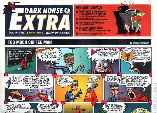 The monthly Dark Horse Comics Fanzine. Oversized, like a newspaper! Contains the scoop on the upcoming Dark Horse comics for the month plus monthly installments of comic stories featuring your favorite Dark Horse characters. THIS MONTH features: Too Much Coffee Man by Shannon Wheeler. "Toxic Sock Syndrome (Featuring Pip & Norton) - Part 4" by Dave Cooper and Gavin McInnes. Pantomimes by Sergio Aragones. PLUS a Hellboy Junior Lurid Easter Special poster by Bill Wray!
