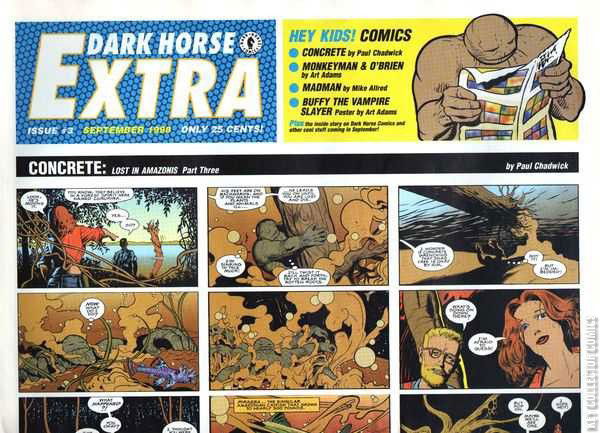 The monthly Dark Horse Comics Fanzine. Oversized, like a newspaper! Contains the scoop on the upcoming Dark Horse comics for the month plus monthly installments of comic stories featuring your favorite Dark Horse characters. THIS MONTH features: Concrete in "Lost in the Amazonis - Part 3" by Paul Chadwick. Monkeyman & O'Brien Part 3 by Art Adams. Madman in "Hospital Havoc - Part 3" by Mike Allred. PLUS a Buffy the Vampire Slayer poster by Art Adams!