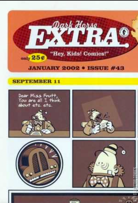 Start your New Year off right with the January issue of Dark Horse Extra. Take a sneak peek at one of the gripping pieces from the most important book you need to buy this year: the upcoming tribute collection, September 11. Remember: all the artwork, writing, editing, solicitation, and production costs have been donated by a variety of partners, and ALL proceeds from sales will go directly to relief funds. Also in this month's Extra, have a paranormal experience with the next installment of the B.P.R.D. strip, inspired by the characters from Mike Mignola's Hellboy. And Shannon Wheeler's Too Much Coffee Man was just too damn good to stop at two parts, so we're giving you an extra strip! Our resolution this year is to give you cool things, and we're starting with the Astro Boy poster featured in this issue. Plus, get the dish on every upcoming Dark Horse January title and the latest news from www.darkhorse.com. Start of 2002 right -- pick up your copy of Dark Horse Extra! Story Titles Too Much Coffee Man Part 3 by Shannon Wheeler B.P.R.D. Part 2 by Christopher Golden, Ryan Sook and Dave Stewart September 11 by Roger Langridge