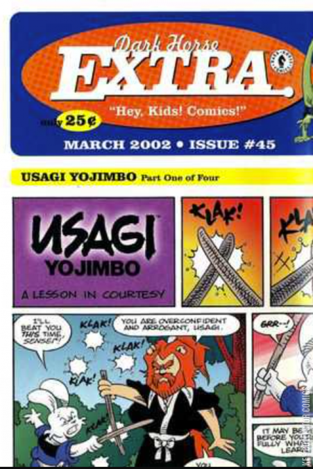 March right into your comic shop this month, fanboys and girls, and pick up issue #45 of Dark Horse Extra! Who needs leprucans this month when you've got a samurai rabbit? Check out an all-new Usagi Yojimbo strip from Stan Sakai! And by the time this issue is on sale, it'll be just two months until the release of the next Star Wars film! Get into the galaxy groove early with the next installment of our Star Wars series! And everyone's favorite teen superspy returns with an all-new adventure-- don't miss out on the dynamic SpyBoy! Plus, the ultimate crossover comes back for another installment, and we give you a sneak peek with a Superman/Aliens II poster! And don't forget, every month Extra dishes the latest news on every upcoming Dark Horse title for the month ! So come in like a lion, pick up your copy of Dark Horse Extra, and go out like a lamb! Story Titles Star Wars: "Poison Moon - Part 2" by Michael Carriglitto, Adrian Sibar and Dan Jackson SpyBoy in "Wrassle Hassle - Part 2" by Norman Lee, Pop Mhan, Sanford Greene, Kris Kaufman and Dan Jackson Usagi Yojimbo Part 1 by Stan Sakai