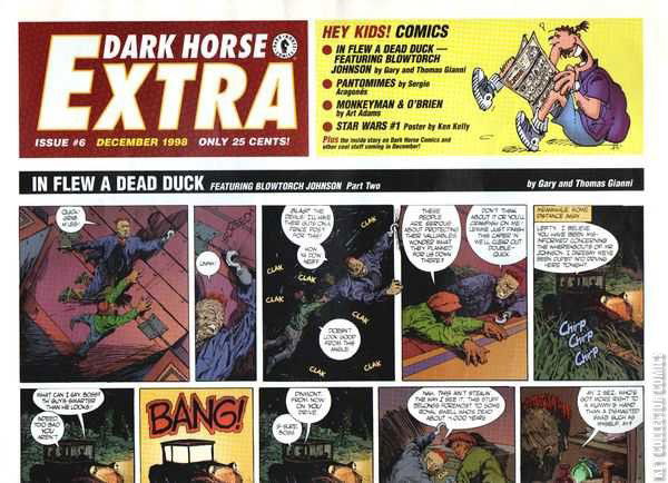 The monthly Dark Horse Comics Fanzine. Oversized, like a newspaper! Contains the scoop on the upcoming Dark Horse comics for the month plus monthly installments of comic stories featuring your favorite Dark Horse characters. THIS MONTH features: "In Flew a Dead Duck (Featuring Blowtorch Johnson) - Part 2" by Gary Gianni and Thomas Gianni. Pantomimes by Sergio Aragones. Monkeyman & O'Brien Part 5 by Art Adams. PLUS a Star Wars #1 poster by Ken Kelly!