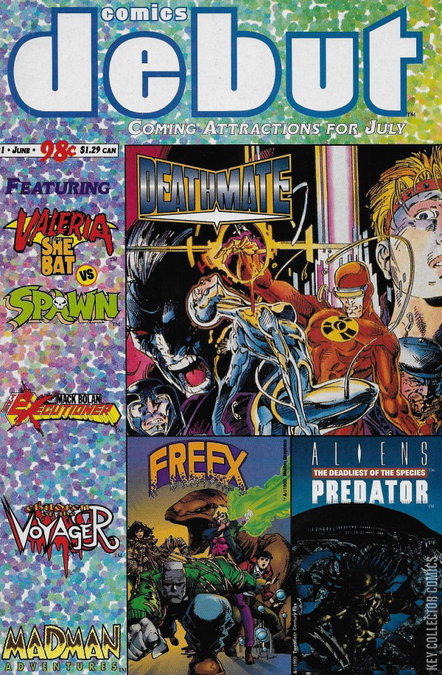 Preview book for the upcoming month's comic releases. Includes a rare preview of the unpublished pages of "Valeria the she-bat #3" which features one of the earliest crossovers of "Spawn", art & story by Neil Adams.