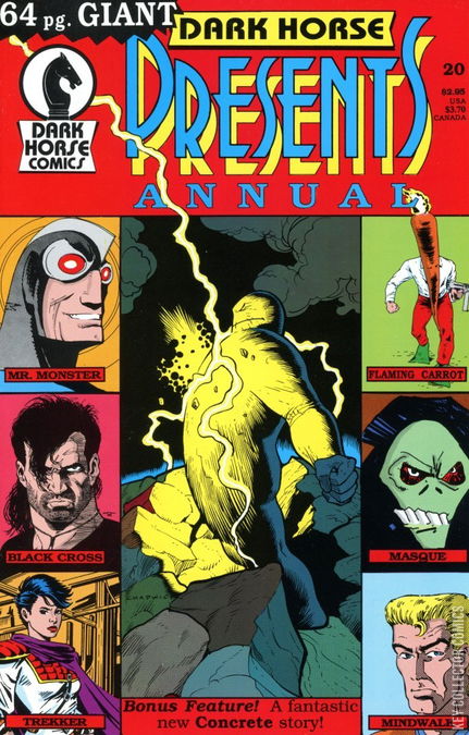 An all-new, all-star Annual! This double-sized, square-bound issue contains sixty four pages (no ads), featuring all new stories from the creators who have made Dark Horse Presents the most respected anthology title on the stands today: Concrete, by Paul Chadwick; Trekker, by Ron Randall; Mindwalk, by Randy Stradley and Randy Emberlin (last seen in DHP #4!); Masque, by Mark Badger; Bob the Alien, by Rich Rice; Wacky Squirrel, by Mike Richardson and Jim Bradrick; plus--a special appearance of Black Cross by Chris Warner, a new four-page Mr. Monster story by Michael T. Gilbert, an appearance by Bob Burden's Flaming Carrot, a new story by Gary Davis, and more!ChaptersMr. Monster: "The Thing in Stiff Alley." Mr. Monster, out on patrol, responds to the cries of some terrified citizens. Following the blood-curdling growls of the creature that has terrorized them, Mr. Monster is frightfully disappointed when he discovers that the creature's small size does not match its formidable growl.Anomaly: Humanity's is set for its first foray beyond the solar system in the intersteller spacecraft, The Marathon. The crew encounter an enormous alien artefact beyond the orbit of Pluto.A Mother's Tragedy: A mother's account of the growing emotional distance between herself and her son.Trekker: "Vincent's Share, Part 1" Mercy St. Clair tracks her one-time collaborator, Vincent, to the outpost of Gamma-7. He'd skipped out on her after their last job with her share of the payment. She intends on getting what she's owed but Vincent offers her the chance of a bigger payday if she'll help him bust the bounties that he's trakking.The Mystery Men: A brief historical account of the founding of The Flaming Carrot's band of Mystery Men.The Visit: A man tracks down his derelict father in order to say goodbye before moving to another part of the country.Masque:Concrete: "Watching a Sunset"Bob the Alien: "Goes Birddogging"Mindwalk: Garrett feels that his extraordinary abilities have become a burden and...