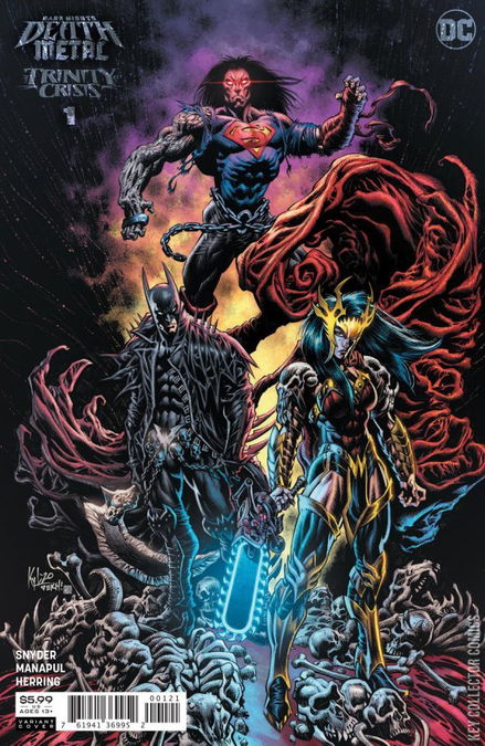 TRINITY CRISIS With Superman freed from his New Apokolips prison, the classic Trinity lineup is back together and ready to rock their next gig. Wonder Woman, Batman, and Superman amp up their power to launch an assault on Castle Bat, and that’s just the warm-up act! Three walking nightmares are hidden deep inside the fortress—but these Dark Multiverse versions of the Anti-Monitor, Superboy Prime, and Darkseid hold the key to humanity's survival. The Justice League have to face down their old nemeses, but will round two be the end for our heroes? DARK NIGHTS: DEATH METAL TIE-IN