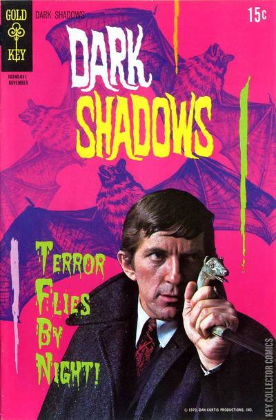 Number/month on cover: 10240-011, November. Comic book version of the spooky and suspenseful daytime drama TV series that originally aired weekdays on ABC-TV from 1966 to 1971. This issue features "Wings of Fear - Part 1: Barnabas Collins - Vampire" and "Part 2: The Willing Victim," a book length tale in which Barnabas Collins has reverted back to his monstrous and evil ways - or has he??? Issue also has Gold Key Comics Club features. Last photo cover. Story and art credits: unknown.