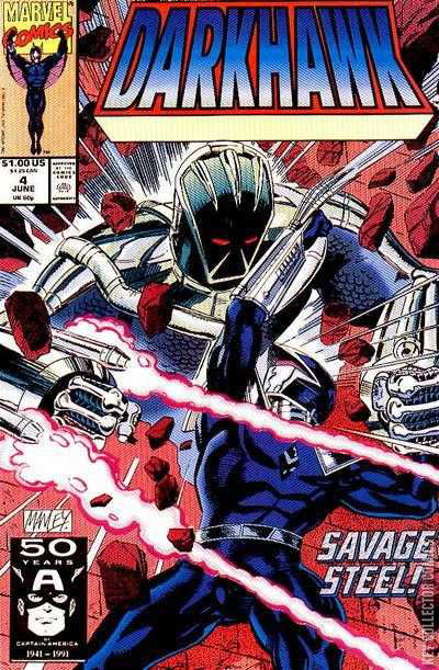 "Savage Steel" Most people try to break out of prison, Darkhawk is trying to break in. He infiltrates Riker's Island to find information about his father's connection to the mob. The break in doesn't go quite as smoothly as he hoped as the guards are alerted to his presence. After talking a one of the prisoners, Darkhawk goes to make his escape only to find himself surrounded by the prison guards. Darkhawk doesn't want a confrontation and opts to grapple over the guards to make his escape, but one of the cons grabs a gun and holds one of the guards hostage. Darkhawk, not wanting to set the prisoner free, discovers a targeting computer for his grapple claw which he previously unaware he had. He uses the claw to knock out the con and then makes his escape to the water, but not before taking several bullets to the chest. Darkhawk climbs aboard a nearby boat and makes his way back to the main island. Darkhawk turns back into Chris Powell and rides his bike home to see his mom and two brothers. A short while later, he is back out on his way to the airport to see what his informant had told him about. Once he arrives, he turns back into Darkhawk and notices his bullet wounds are no more. There he finds a drug deal going down, but before he can do anything about it, he is attacked by Savage Steel. The battle rages on and catches the attention of the drug smugglers and they take off in their sedan. Savage Steel gives chase though and destroys the car with everyone and everything inside. He then retreats having accomplished his mission.