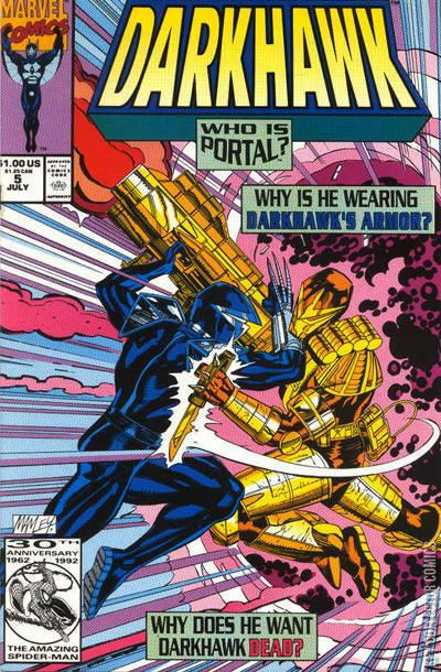 "Fury from Beyond" This issue, we learn more about the mysterious origins of the Darkhawk amulet from Portal, an interdimensional traveller.This issue introduces a new villain named Portal, a Native American mutant who can open portals to different multiverses. During a day at the museum, the Powell family gets attacked by a Bazin hitman. Darkhawk stops the hitman and darkforce blasts Portal unconscious while trying to save himself.
