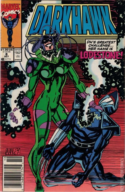 "Lodestone!" Lodestone captures Darkhawk with her magnetism powers and takes him to Bazin’s lab to be studied and have the amulet removed. Darkhawk breaks free with Allegra’s help.