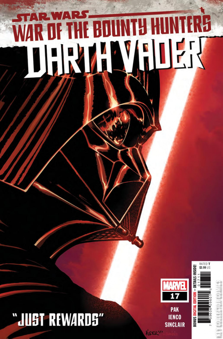 JUST REWARDS Throughout the search for HAN SOLO, DARTH VADER has carved his way through shadows, unraveling mysteries cloaked in deceptions and betrayal. Now Vader finally takes care of all his business in this blockbuster conclusion to the WAR OF THE BOUNTY HUNTERS story arc. But is he the true master of betrayal in this tale? Or is there another? WAR OF THE BOUNTY HUNTERS TIE-IN