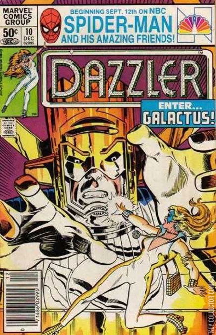 After absorbing the entire body of the supervillain the Klaw (whose whole body is made of "solid sound") in the previous issue, Dazzler's powers have grown off the scale. She comes to the notice of Galactus, who recruits her to track down his current herald, Terrax; who has just deserted him.