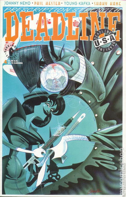 Ready to leave the sheep and join the wolves? Then sink your choppers into Prescription Strength DEADLINE U.S.A. #4, featuring only the choicest cuts of alternative comix prepared in the manner suited to the cultured palates of urban sophisticates like yourself. This issue features Philip Bond's Wired World, Scott Musgrove's Tortilla Baby, Johnny Nemo by Peter Milligan and Brett Ewins, Brian Everson's Young Kafka, A-Men by Shaky Kane, Jack Pollock's Devil Chef, Timulo by D'Israeli, Phil Hester's Nail Boss and more. Cover painting by Stan Shaw!