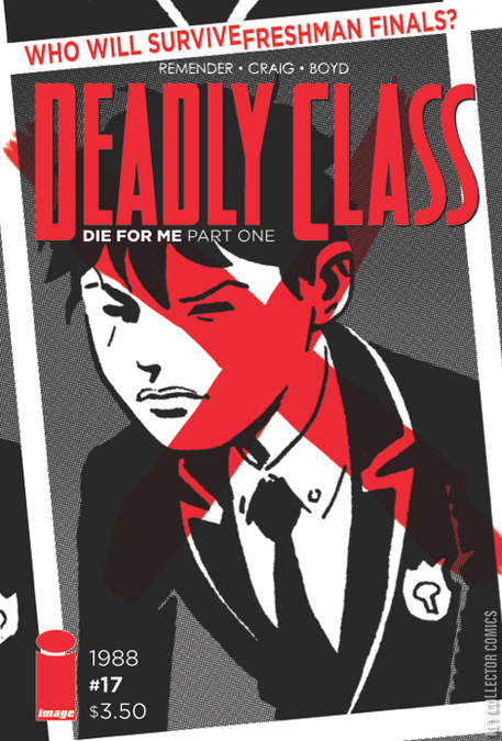 NEW STORY ARC The Kings Dominion school grounds become a killing field, and Marcus Lopez is hunted by his classmates for their final exam. Onetime friends and lovers become hunters in the dark, brandishing blades, bullets, and a burning desire to become best in class. Sign up with RICK REMENDER (BLACK SCIENCE, TOKYO GHOST), WES CRAIG (BLACK HAND COMICS), and JORDAN BOYD (INVISIBLE REPUBLIC, Planet Hulk) for the bloodiest year of DEADLY CLASS yet!