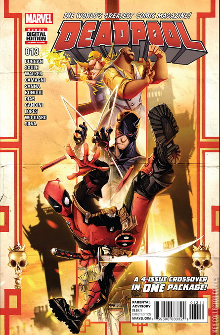 DEADPOOL #13: TEMPORARY INSANITATION, PART ONE / DAREDEVIL #7.1: TEMPORARY INSANITATION, PART TWO / POWER MAN AND IRON FIST #4.1: TEMPORARY INSANITATION, PART THREE DEADPOOL #13.1: TEMPORARY INSANITATION, FINALE An all-new epic four-issue crossover in one package! This issue of Deadpool (lucky number 13) LITERALLY contains two issues of DEADPOOL, one issue of DAREDEVIL, and one issue of POWER MAN & IRON FIST! When Deadpool take a gig protecting a banker who betrayed his cartel partners, they seek the help of Assistant District Attorney Matt Murdock, who calls in the assistance (and fists) of Power Man (Luke Cage) and Danny Rand, master of the Iron Fist! A mega-violent, street-level, face-punching, gut-busting, kung-fuing, ninjitsuing crime story guaranteed to knock your teeth out! Bringing together the writers of the DEADPOOL , DAREDEVIL , and POWER MAN & IRON FIST series: Gerry Duggan, Charles Soule, and David Walker!