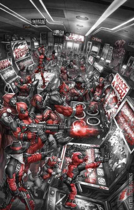 RED ALL OVER / HOTLINE TO HEAVEN / BORN IN THE USZORSUSR LIKE A CLASSIC BLACK & WHITE MOVIE, BUT WITH WAY MORE BLOOD! What’s black, white, and red all over? Three blood-drenched tales of violence and mayhem led by Marvel’s Mirthful Mercenary himself, Deadpool! You want to see today’s top talent take it to the hilt to bring you the wildest Wade Wilson adventures yet?! This is the book for you! It’s as plain as black and white. And red.