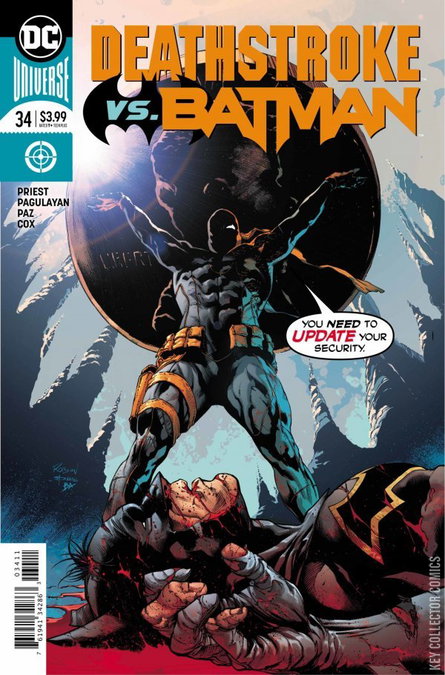 DEATHSTROKE VERSUS BATMAN, PART 5 OF 6: THE STORMY PRESENT Our two marquee combatants are locked in the Batcave, forced to resolve their differences—or die trying! The showdown only turns saltier when the feds seize Bruce Wayne’s assets, including Wayne Manor, after Slade drops a dime. And Deathstroke shows Batman he’s not the only detective in town, as Slade closes in on the mystery of his relationship with Robin. EDITOR'S NOTE: This story takes place before Detective Comics #967 .