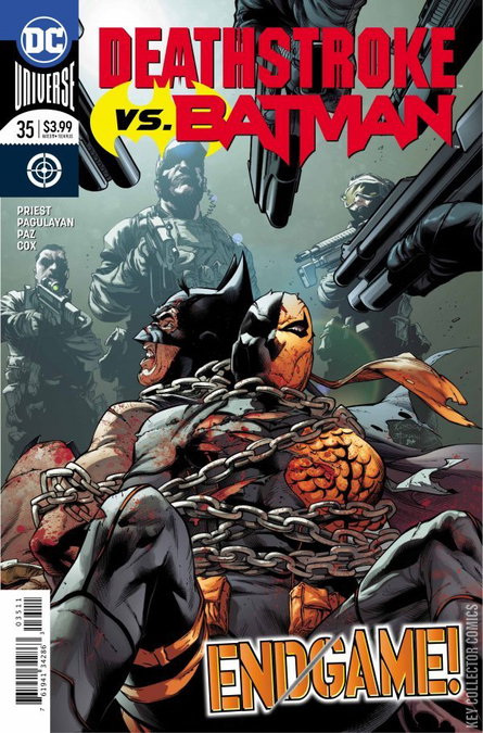 DEATHSTROKE VS BATMAN: THE DEFIANT ONES, PART 6 OF 6: CONCLUSION In this corner: Deathstroke, suffering from a traumatic brain injury at the hands of Batman! In the other corner: Batman, with Deathstroke's knife in his gut! All of this with the feds invading Wayne Manor—and now they're in the catacombs under the mansion, which lead to the you-know-what-cave! If they're going to escape, Batman and Slade are going to have to work together.