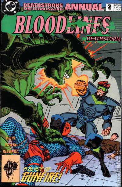 BLOODLINES: DEATHSTORM PART 17 - A BLAZE OF GUNFIRE Continued from Hawkman Annual #1 As the alien parasite Venev cuts a gory swath of destruction across France, she comes head to head with Deathstroke. This tale finally answers the question of where Deathstroke gets his hardware, as we meet weaponsmith Gunther Von Horn...just in time for him to be slaughtered by Venev! Continues in Eclipso Annual #1