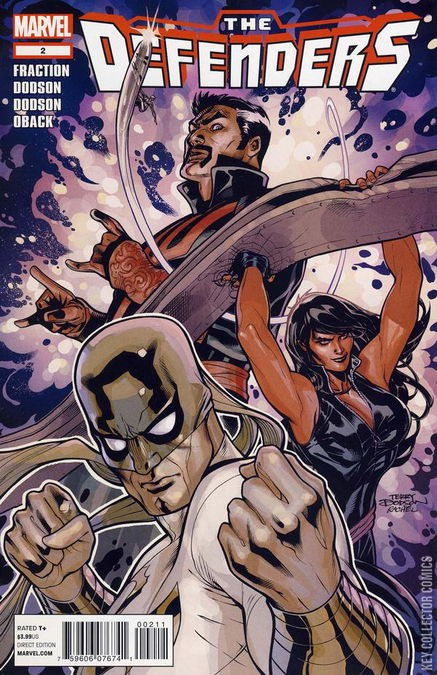 "Breaker of Worlds - Part 2: The Prize of New Avalon" Iron Fist lies critically injured on the slopes of Wundagore Mountain. With an effort of will, he uses his chi to force the bullet out and close the wound. Then he joins his fellow Defenders in battle with Prester John and his beast-headed New Men. The Defenders, though outnumbered, are able to match their adversaries until Prester John turns the Evil Eye on the Silver Surfer, enclosing him in an odd bubble of energy. Under threat of having that same power turned on them, the rest of the Defenders surrender and are taken to New Avalon, a secret city below the mountain. Elsewhere, Nul is on his way to Wundagore as well, shattering everything in his path. Locked in a large cage and fitted with custom restraints, the team try to understand the situation. Strange explains that Prester John is not from their time -- he is best known as the leader of a 12th-century colony known as Avalon -- and his sanity is dubious. Red She-Hulk, left largely unrestrained, is able to free them by shrinking to her human size and squeezing through the bars. Though Surfer is still imprisoned in his bubble, the rest of the Defenders quickly bring the battle to the New Men. Prester John tells his general, Tagar, to kill them quickly, and then approaches Surfer with the Evil Eye. He asks for understanding, claiming that the world is doomed, "warped and sick, infected with violence and hate." The Defenders reach him before he can take the Surfer's life, but with the Evil Eye held to Surfer's head, they have no choice but to halt. Strange and Namor try to reason with Prester John, saying that Nul is coming and would destroy them all, but John already knows. He tells them Nul is being drawn to the Concordance Engine, and that when he breaks it, he will break the world -- a world John thinks needs breaking because it is "violent, loveless, [and] entirely mad." Prester John plans to bring his faithful aboard an ark: a spaceship that will carry them to a new home in the new universe. The Concordance Engine, a shining arrangement of pipes that seems to make everything around it less real, is located deep beneath Wundagore Mountain and guarded by a silent, masked knight whom Prester John calls brother. As the Defenders stand before it, Nul arrives and begins to fight his way into New Avalon.