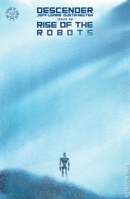 “RISE OF THE ROBOTS,” CONCLUSION The fall's big DESCENDER event concludes in explosive fashion as the UGC and the Hardwire converge, and Tim and Telsa make their final stand against the murder machine known as Tim-22. This issue forever alters the course of DESCENDER. Each issue in this arc will have variant covers featuring one new section of a dazzling interlocking image jam drawn by both LEMIRE & NGUYEN!