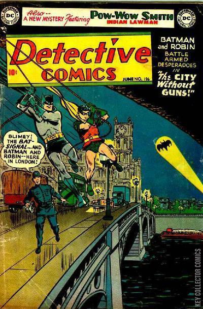 CITY WITHOUT GUNS A wanted criminal escapes Gotham City and heads towards London. A month later Bruce and Dick visit London and go to Scotland Yard to learn about British detection methods, where they are shocked to see a frame that once held a picture of Batman and Robin empty. Before being able to inquire about the missing picture an alarm sounds for a crime in Leicester Square. Responding to the crime with Scotland Yard as Batman and Robin, they discover that the fugitive from Gotham a month earlier has set up shop in London. With the help of Scotland Yard and one of their more zealous British fans, Batman and Robin track down the fugitive and capture him on the Oxford campus. Before leaving London Batman and Robin discover that their fan, who has helped them during their stay, took the picture from the wall in Scotland Yard's headquarters, because he believed that the British police were not displaying the photo in a proper place of honor. THE MAN FROM THE 5TH DIMENSION! THE REPEATING ROBOTMAN! THE GARMENTS OF THE GOLDEN CHIEF