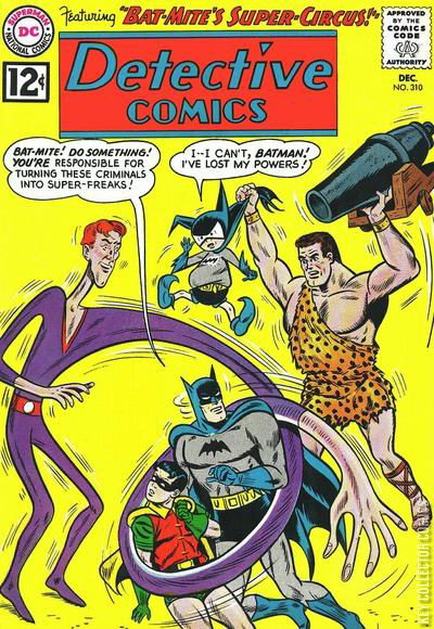 BAT-MITE’S SUPER-CIRCUS! Bat-Mite comes to Earth and gives three crooks super-powers to make them more challenging to Batman and Robin. But, a bump on the head blocks Bat-Mite from using his powers against the crooks, and the three opponents may be more than the heroes can handle. The strongman, the rubberman and the human cannonball are unstoppable with their powers combined and the heroes are captured and left to die. Unsurprisingly, Batman devises an escape and warns Gotham of the 3 criminals' presence in the city. With the city alert the three criminals split up to steal as much as possible before fleeing the country. With the criminals separated, Batman and Robin set about the task of capturing them all. Batman first tricks the Strongman into punching himself, knocking him out. Later, he tricks the Rubberman into bumping his head on a doorway as he tries to dodge one of Batman's punches. Finally, the Dynamic Duo are unable to stop the human cannonball, but Batm-Mite's powers return in time to change the crook back to normal and thwart his efforts to kill the dynamic duo. Batman then realizes that Bat-Mite got his powers back when they confronted the Rubberman, but didn't use them so that Batman and Robin could continue to fight the criminals for his amusement. Fearful of Batman and Robin's retribution, Bat-Mite returns to his own dimension predicting his inevitable return. THE MINIATURE MANHUNTER After J'onn J'onzz is shrunk by a size-changing machine invented by criminal scientist Victor Vance, he uses his small size to his advantage in battling and defeating Vance. Then he dupes Vance into restoring his normal height, and reduces Vance temporarily to tiny size in order to take him to the police.