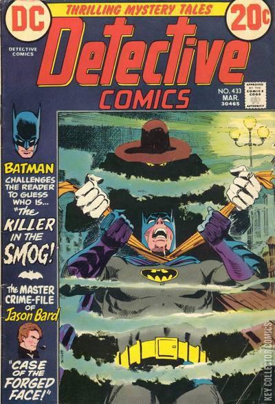 KILLER IN THE SMOG! Batman and Commissioner Gordon try to uncover the mystery of a strangler who strikes during smoggy days, and throttles his victims with a yellow ascot. After finding three victims of the murderer, Batman and Commissioner Gordon conduct separate investigations in order to find the killer. Gordon manages to find a dead man, suspected of being the murderer, but Batman finds the real killer, who is not one person, but three men who conspired to help each other and eliminate their enemies. THE CASE OF THE FORGED FACE! Jason Bard must track down the would-be assassin of a senator who has impersonated Bard in three cities.