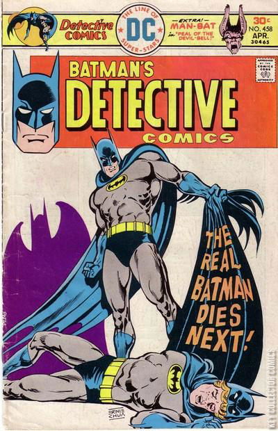 THE REAL BATMAN DIES NEXT! At a costume fundraiser, a man dressed as Batman dies in Bruce Wayne's arms. His cowl is removed, and he is identified as Lt. Bucky Dunlop; the words "The Real Batman Dies Next!" appear to have been tattooed on his forehead. Gordon is there, and orders all in attendance, including Bruce, to remain behind. As Bruce checks into a hotel room, he realizes that the man had been shot by a gun with silencer. In his hotel, he calls Alfred, who patches him through to Gordon to tell him what happened. As Batman, he tells Gordon that he won't appear, as Dunlop's murder indicates he is the next target. Batman then goes to the Dunlop family, and tells them that Bucky is missing, unable to tell them the truth. Mrs. Dunlop tells Batman that he and Slats Johnson, a friend and ex-convict who owns a tattoo parlor, volunteer every Thursday as part of a juvenile rehabilitation program. Meanwhile, Gordon and the police find a rifle, rigged to fire by remote, in the ceiling; they also learn that the tattoo ink used on Dunlop is a kind of invisible ink that disappears with heat, meaning that he could have been tattooed at any time. Batman returns to the hotel and redresses as Bruce; he then finds Gordon and drops a hint about volunteer work, which leads Gordon to investigate any contacts from that program. Three are found - Johnson, Fellman and Squire, all of whom Bruce recognizes from his crime fighting. Bruce changes again to Batman, planning to investigate all three men; he goes to Johnson's apartment, where he finds his tattoo equipment, unused. Batman then goes to Fellman's place and discovers a recently opened can that he finds suspicious, and takes it to run some tests. Slats Johnson is arrested for the crime, but pleads his innocence. The rest are set free, but Batman captures captures Fellman and brings him to Gordon, telling him that Slats is innocent, as his tattoo work is different from the calligraphy used in the crime. Fellman, conversely, studied calligraphy during his prison time; Batman then mentions the disappearing skin dye was found at Fellman's place. Fellman is arrested, and Slats is set free. PEAL OF THE DEVIL-BELL! Britt Langstrom finds Francine strapped to a bed, and she frees her, but Francine changes into the she-bat. Britt's brother, Kirk enters, captures his wife, Francine, and injects her with the serum that changes her back; when the metamorphosis is complete, it turns out to be another woman. Meanwhile, Dr. Thanatogenos considers the Langstroms to be the perfect substitutes and sounds the Demon Bell's Mystic Clapper. This causes Francine to change into her bat form again, and she flies towards the bell; Kirk changes into Man-Bat and follows. As he approaches the tower, Dr. Thanatogenos zaps him with a wand, and Man-Bat pretends to fall, but hangs below the ledge. When the doctor leans over, Man-Bat attacks; Dr. Thanatogenos points out a gargoyle statue that appears to be Francine. In Man-Bat's confusion, Dr. Thanatogenos zaps him again, implying it will be his fate as well.