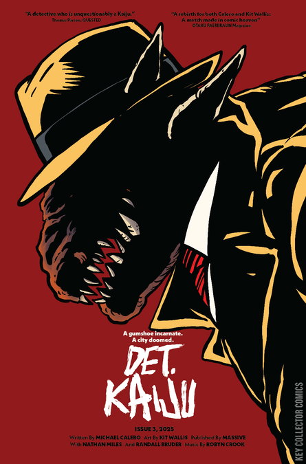 From the pages of the fan-favorite series “Quested” comes a noir comic of epic proportion! Detective Kaiju the hardboiled investigator gets his own mini-series with Quested’s Michael Calero (American Psycho) and Kit Wallis (High On Life) reuniting on the 4-part murder mystery.In this debut issue, Detective Kaiju has to look to his past as he investigates the murder of his friend and former film co-star. Meanwhile, Shaa-Na fights for her life as she becomes the next target of the mysterious killer.