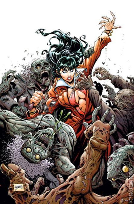 TIME TO DIE ANOTHER DAY! The ravening undead return to resume their feasting upon the living in the newest bloodcurdling chapter of Dynamite’s all-star supergroup adventures in the dystopic future! Outside the crazily fortified gates of Sunset City, the zombie hordes search ceaselessly for their prey — and that means women, because the gender-targeting Deadman virus is strictly a boys’ club. Inside the walls, rival factions jockey for power under the iron thumb of Purgatori and her enforcers, the Furies — including Vampirella, who’s stuck on Earth under Drakulonian quarantine to keep the male plague at bay. But it turns out that Vampi’s not the only alien in the skies — and when someone from a certain red planet arrives on the scene, everyone’s plans will get scrambled like a Deadman on a busy highway! The newly infected creative team of writer FRED VAN LENTE and artist MARCO FINNEGAN unleash all of your favorite femmes fatales in the epic sci-fi grand guignol that is Die!namite: Blood Red #1 — featuring skull-cracking covers from EJ SU, GODTAIL, DAVID COUSENS, and WILL ROBSON!