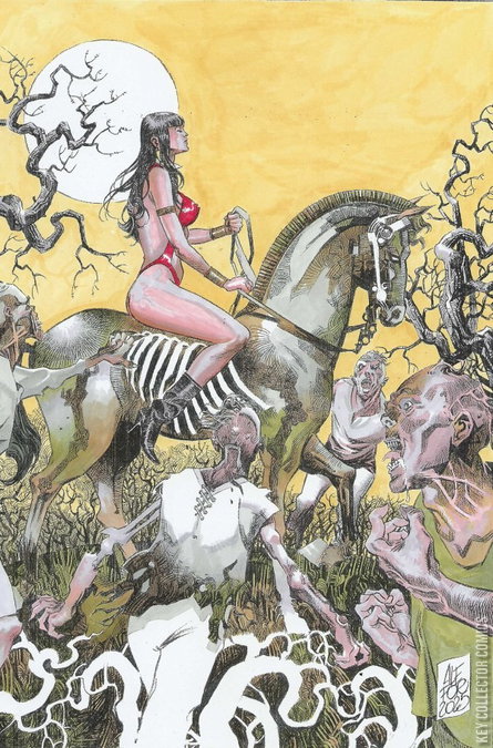 TODAY’S FORECAST: ZOMBIES, ZOMBIES, ZOMBIES! In this sanguinous saga’s gripping finale, the ultimate fate of Sunset City hangs in the balance as the female furies of Mother Earth take on the full might of Martian mayhem! Red Sonja, Vampirella, Purgatori, and any other surviving femmes fatales face betrayals, reversals, and impossible odds at every turn as they race to end the Deadman plague once and for all! Contagion carriers FRED VAN LENTE and MARCO FINNEGAN spread their spores far and wide with Die!namite: Blood Red #5 — featuring spectacular secondary infections from EJ SU, ALESSIO FORTUNATO, EMANUELE ERCOLANI, and WILL ROBSON!