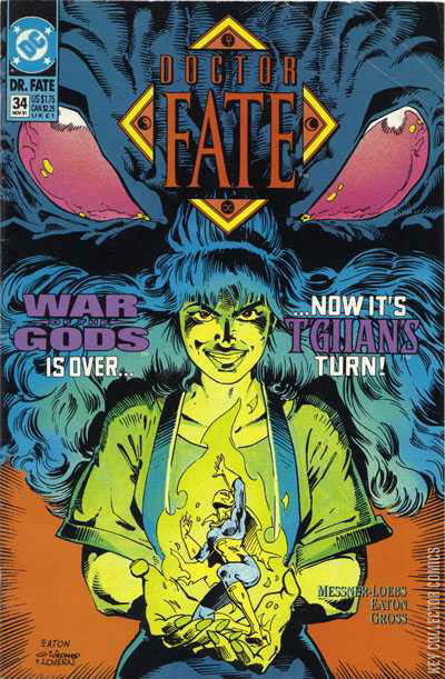 The War of the Gods is over, the Egyptian gods vanquished, so Dr. Fate returns to her neighborhood, to find that it's been conquered by T'Giian, the forgotten goddess.